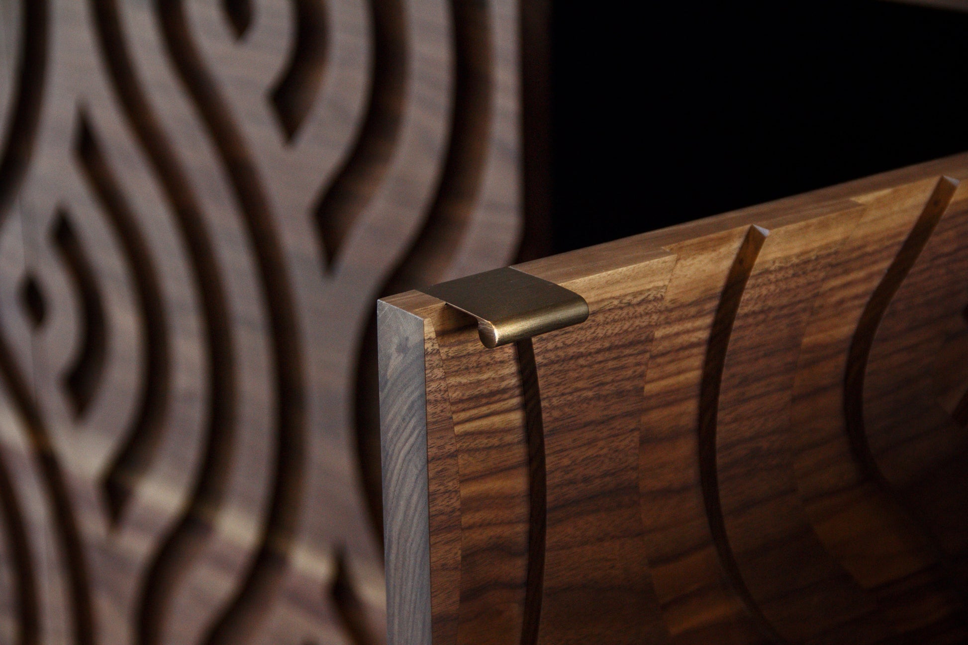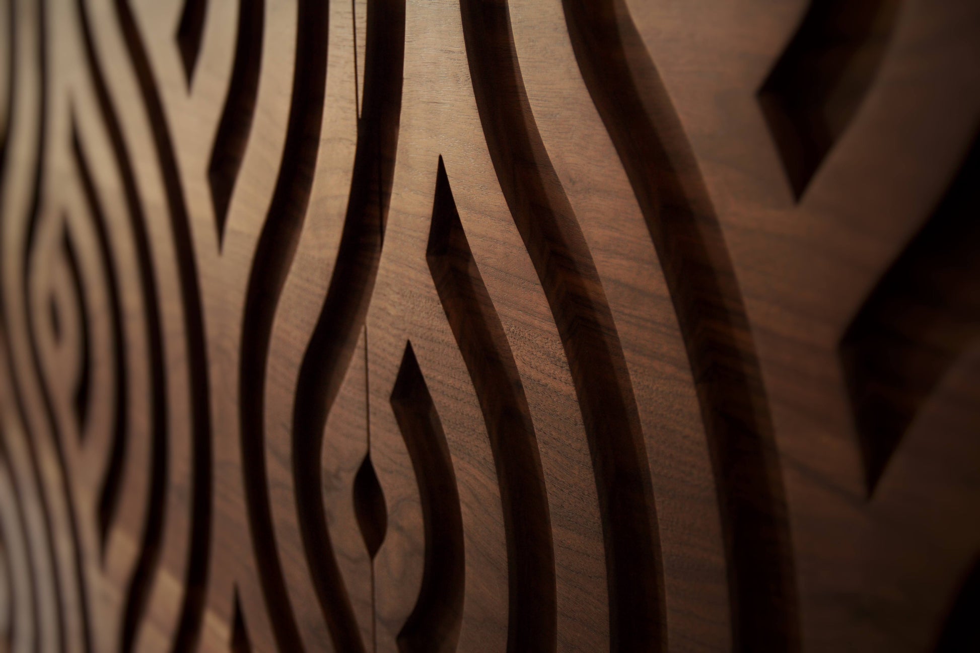 Chaque porte présente des reliefs organiques qui donnent l’impression que le bois prend vie. Une insertion subtile de laiton vient enrichir cette texture en captant la lumière et en ajoutant une touche de raffinement sans compromettre l’aspect brut et naturel de la matière.